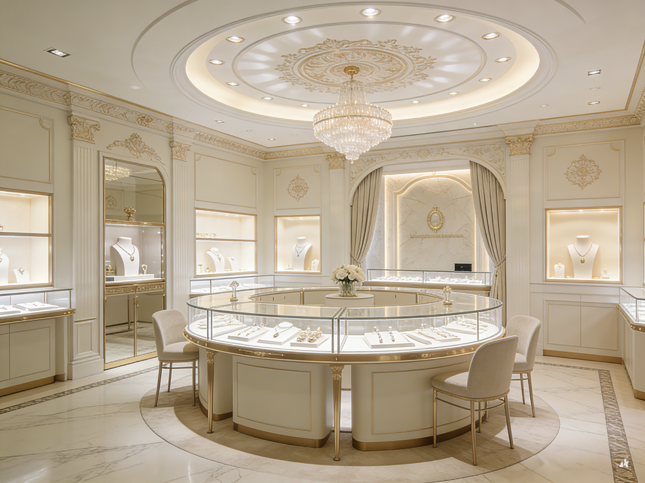 If you’re looking to design a lavish jewelry store with gilded accents, dark wood, and marble elements, we provide expert design strategies to craft a grand and sophisticated retail space:Cultivate a high-end luxury brand identity with a blend of gold metalwork, dark wood paneling, and marble textures.Design a circular central display hub to serve as the focal point and enhance jewelry visibility.Select custom display fixtures that complement the gilded-marble-dark wood palette and elevate jewelry presentations....