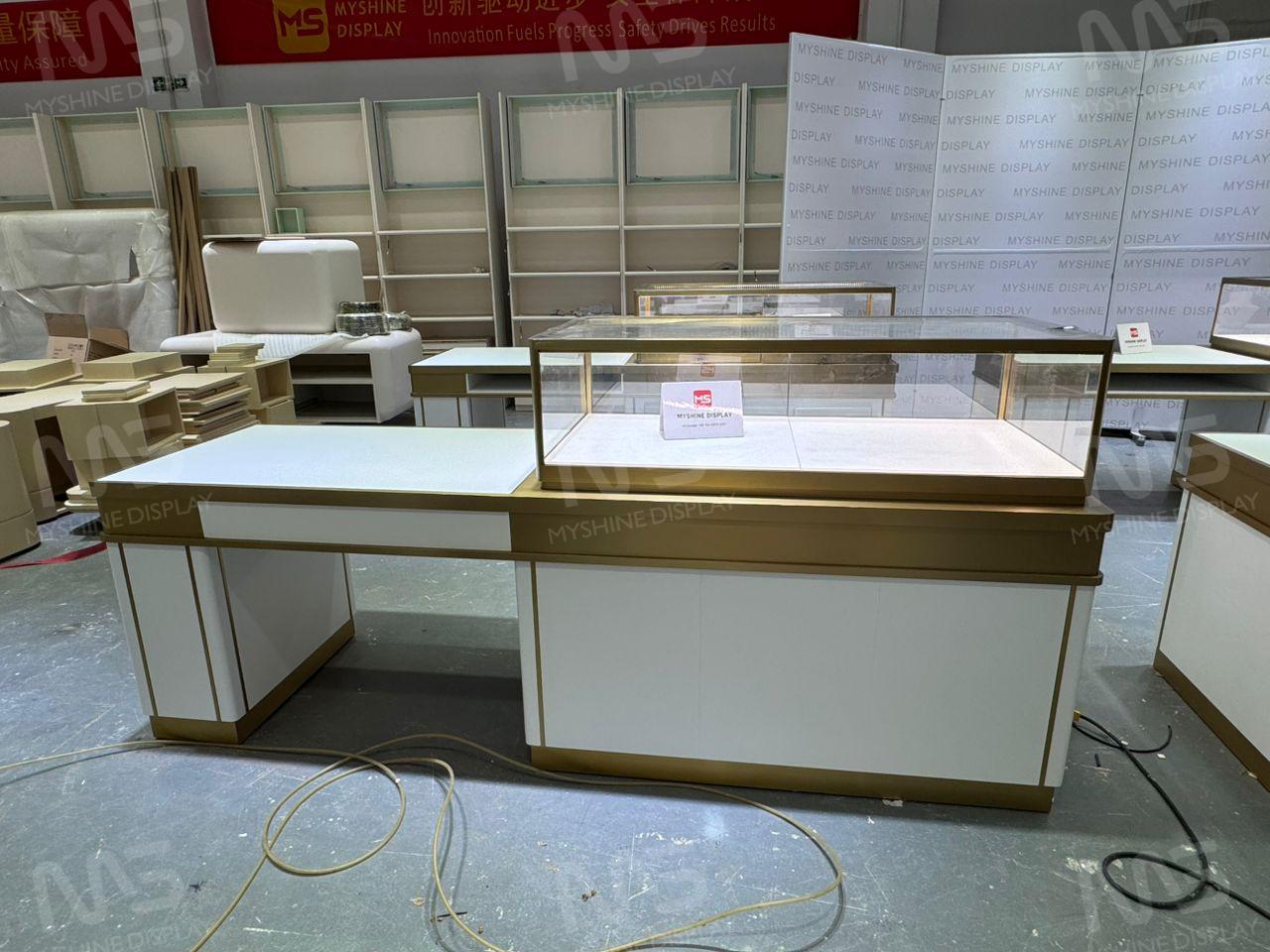 Our client wanted to upgrade their store with a new series of jewelry display showcases that combine a high-end look with clean, modern functionality. After understanding their needs, we customized this series of showcases featuring a white cabinet body with gold metal framing and a clear glass display top — perfectly balancing luxury aesthetics with practical retail use.