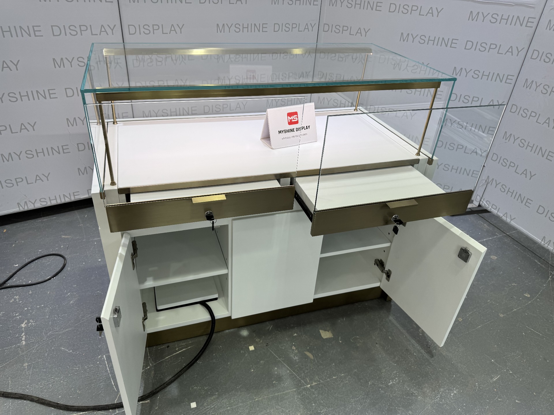 All display cases are built with high-quality materials, featuring a white lacquer finish paired with tempered glass and subtle metal accents. The clean structure enhances durability while maintaining a modern retail appearance suitable for long-term commercial use. Every detail was carefully crafted to meet daily retail demands.