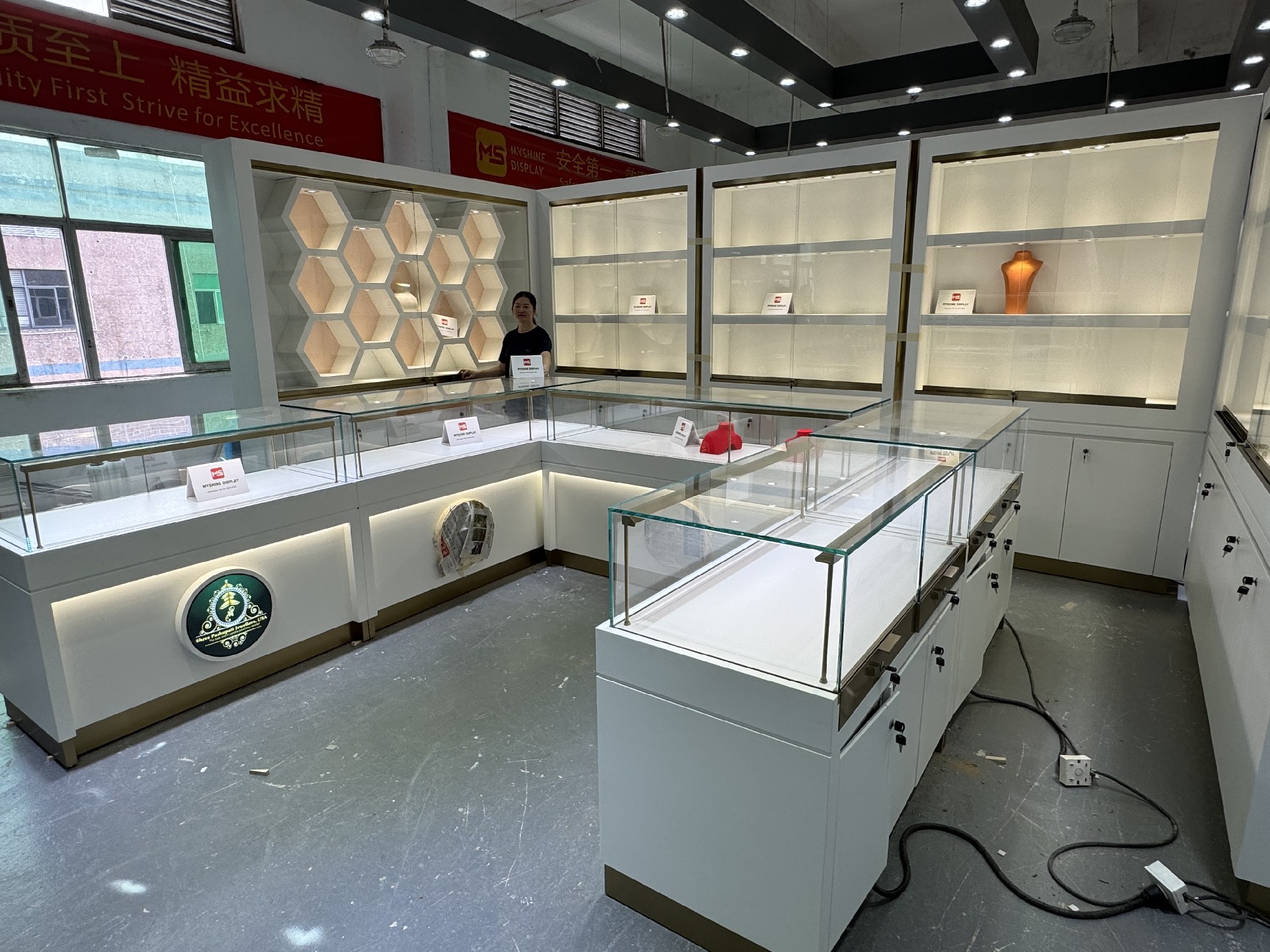 Store layout design, custom display case manufacturing, lighting integration, packaging and transportation, installation guidance, and after-sales support.