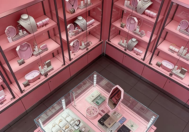 This is a bright and stylish jewelry store with a soft pink color scheme that creates a warm,