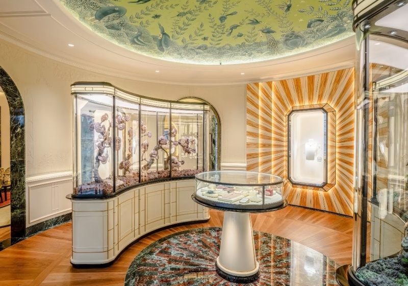 The space blends opulent materials with organic, nature-themed details. The ceiling features a hand-painted mural of flora, fauna, and aquatic life, while display cases are adorned with sculptural tree-branch and moss-like installations,
