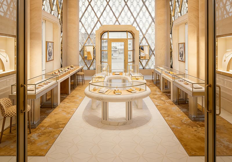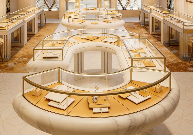 This is an exquisite luxury jewelry store that embodies timeless elegance and refined opulence. The interior is defined by graceful, curved white marble display counters, each framed with delicate gold trim and topped with clear glass cases that showcase fine jewelry, watches, and precious accessories. The floor features a sophisticated geometric pattern in soft ivory tones, accented by plush gold-hued rugs that add warmth and visual depth. Tall, smooth marble columns rise toward the ceiling, while large windows flood the space with natural light, creating an airy, inviting atmosphere. Woven high stools sit beside select counters, offering comfortable spots for personalized consultations. Every detail—from the warm metallic accents to the clean, minimalist lines—works together to craft a premium, serene shopping experience that highlights the beauty and craftsmanship of the jewelry within.