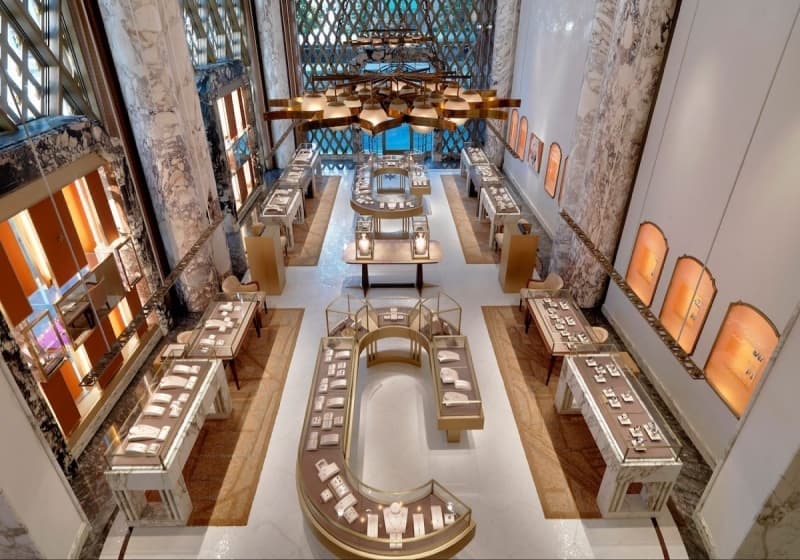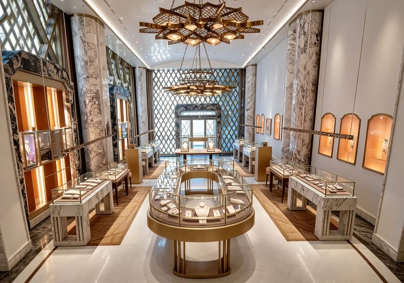 This is a stunningly designed high-end jewelry boutique, where timeless elegance meets modern luxury. The space features a grand, luminous central hall anchored by an iconic gilded chandelier, casting a warm, golden glow over meticulously curated display cases. Polished marble columns with intricate veining frame the layout, while a striking diamond-patterned glass partition at the far end adds architectural drama and natural light.