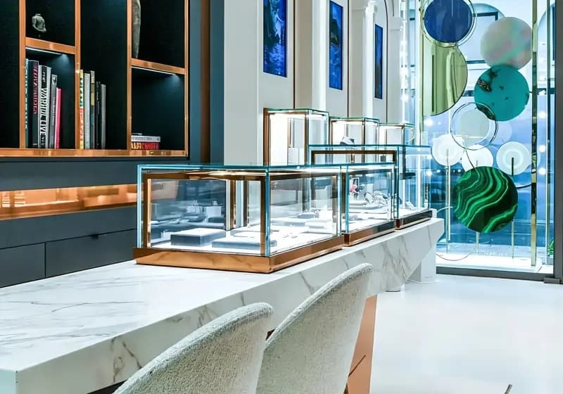 This is a sophisticated, modern luxury jewelry boutique that masterfully blends minimalist elegance with opulent, curated details. Sleek glass display cases with polished rose gold frames rest atop a pristine white marble counter, illuminated by integrated LED lighting to showcase fine jewelry pieces in their full brilliance, while a dark, gold-trimmed built-in bookshelf adds a refined, cultured backdrop. Plush, comfortable seating creates an intimate, private consultation space for clients, and natural light floods the area through a large glass facade, complemented by warm ambient lighting to craft a welcoming, luxurious atmosphere. Vibrant, artistic circular glass installations by the window infuse the space with contemporary artistry, resulting in a bright, airy yet intimate environment that perfectly reflects the timeless luxury of the jewelry it houses.