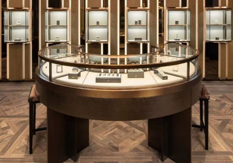 • Luxury Retail Aesthetic Alignment: Our cases mirror the opulent, warm-toned design language of top-tier jewelry boutiques, with options for rich bronze finishes, natural oak herringbone woodwork, and elegant carved detailing that
