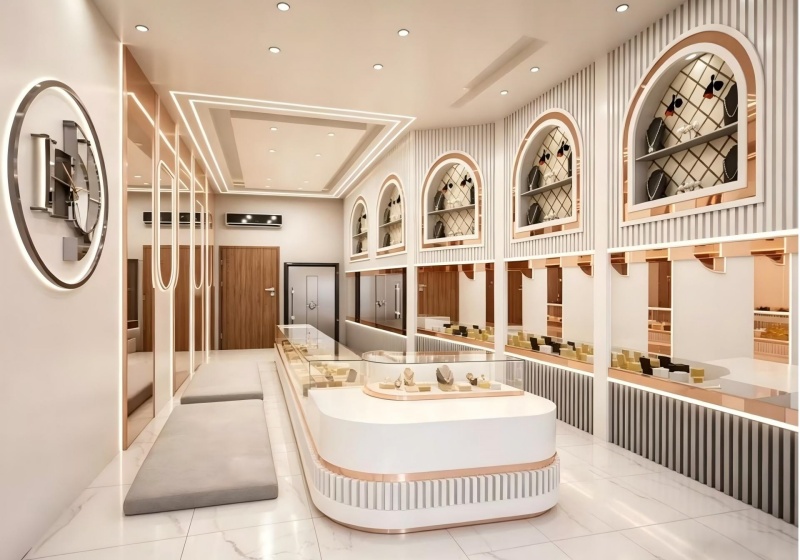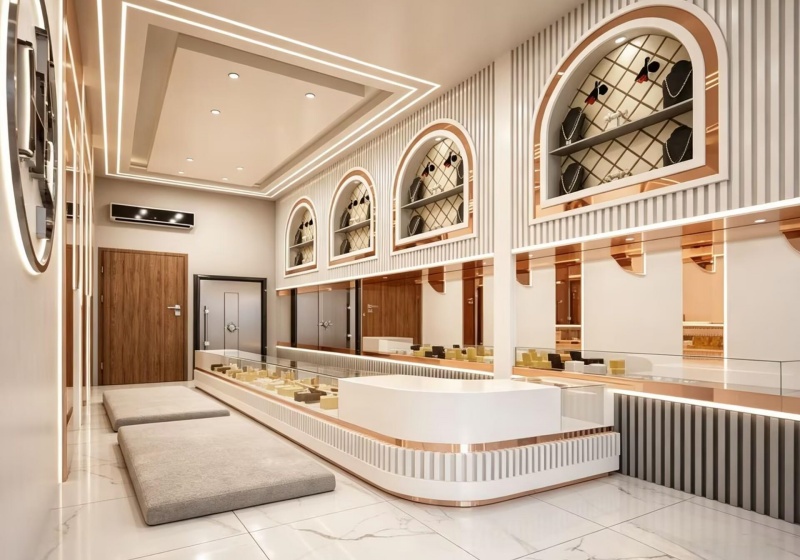 • The open, linear layout combines central island counters, wall-mounted display units, and customer seating, maximizing display space while fostering a luxurious, inviting shopping experience.