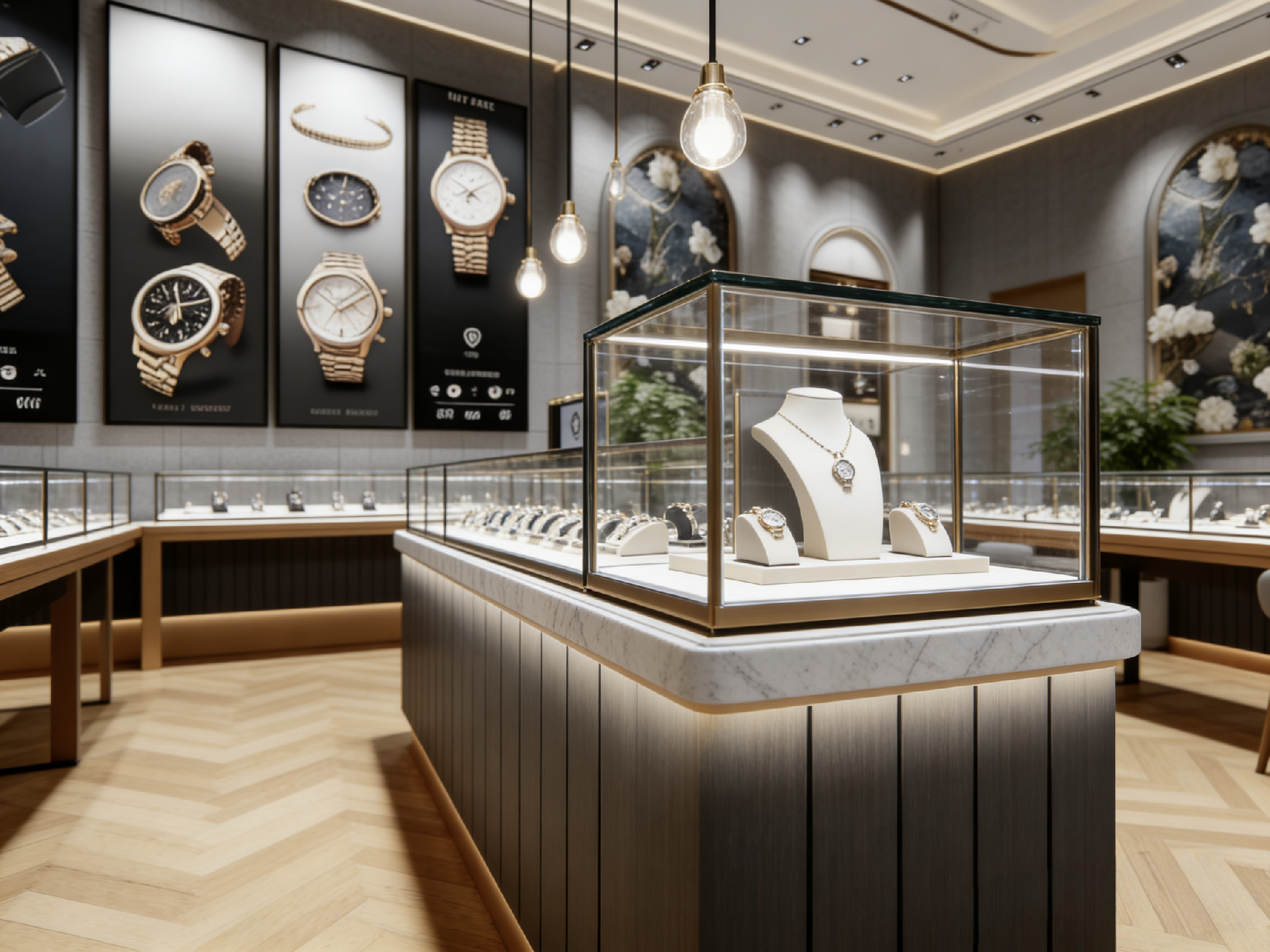 • The open, multi-level layout combines central island counters, wall display units, and customer seating, balancing unobstructed product visibility, client interaction space, and elegant retail aesthetics.