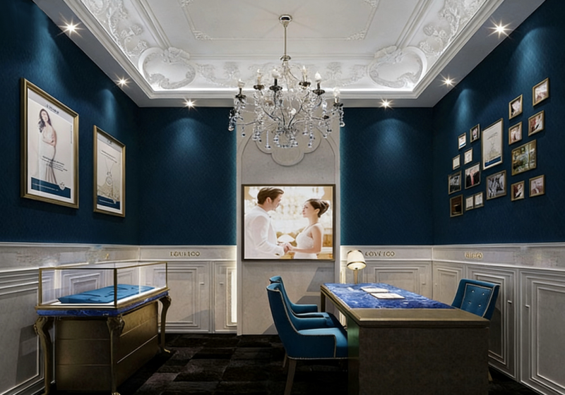 Lighting System: LED spotlights with 3000K warm white color temperature, 90+ CRI (Color Rendering Index), installed on ceiling recesses and inside display cases with dimmable control; light intensity is 500–700mm on display surfaces to highlight jewelry details without glare.
