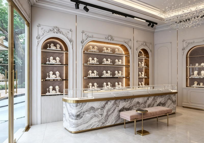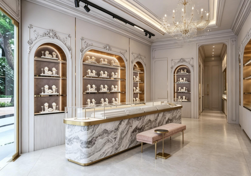 Aesthetic Identity: Intricate plaster carvings, soft cream tones, and brushed gold accents embody classic European luxury, perfectly complementing the brilliance of fine jewelry.