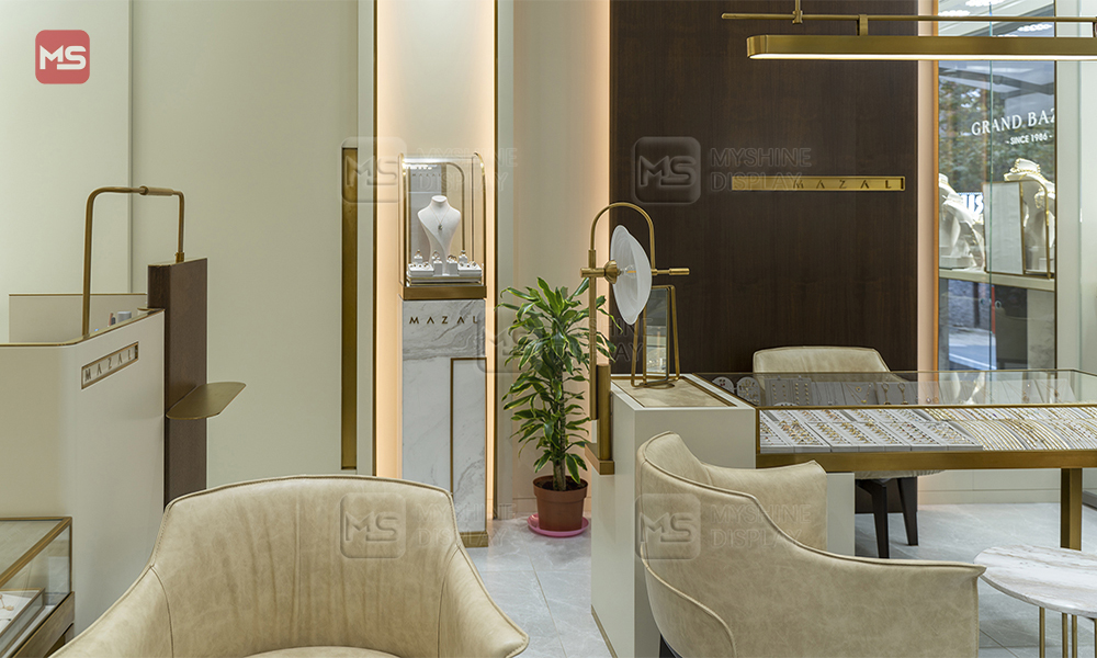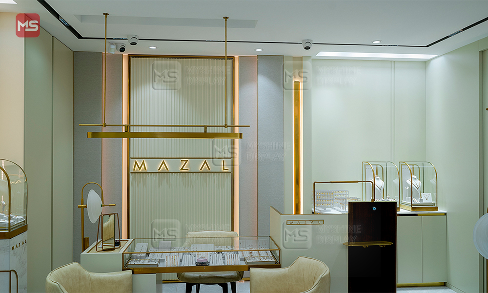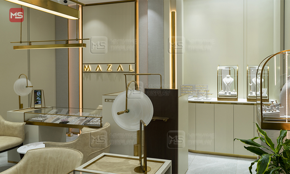 Myshine’s custom display setup blends soft neutrals, gold accents, and sleek glass showcases—turning every jewelry piece into a focal point.