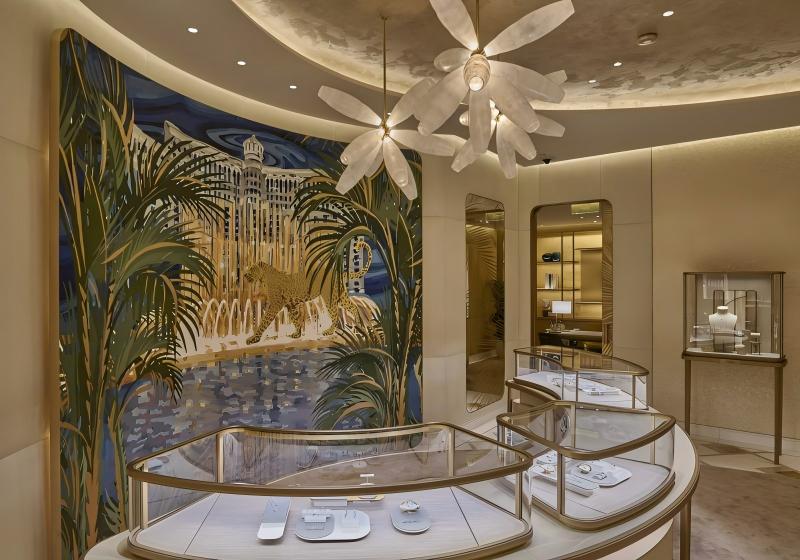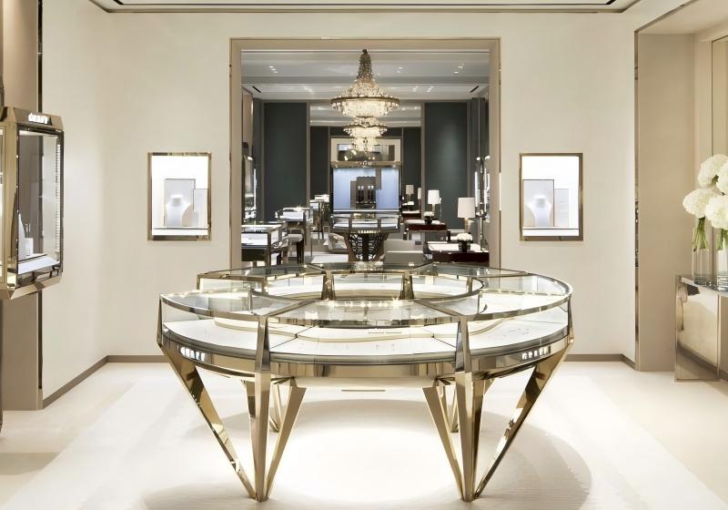 The neutral color palette of soft creams, warm golds, and light wood creates a calm, uncluttered backdrop that complements every jewelry style, from bold statement pieces to delicate everyday designs. Large mirrors and open sightlines enhance the sense of spaciousness, while the arrangement of displays invites customers to wander and explore at their own pace.