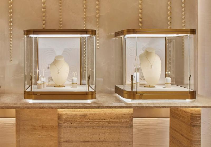 Warm stone finishes paired with champagne-gold accents soften the luxury atmosphere, while ultra-clear glass ensures jewelry remains visually light, elegant, and unobstructed.