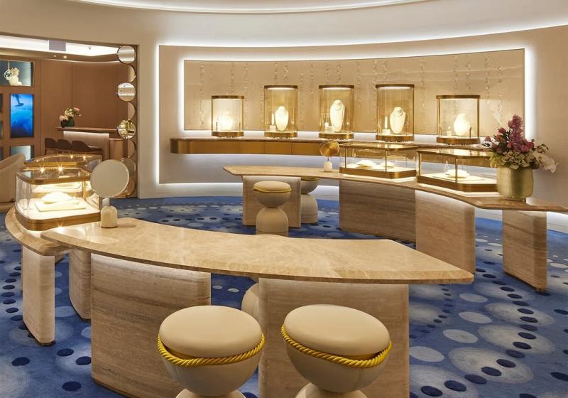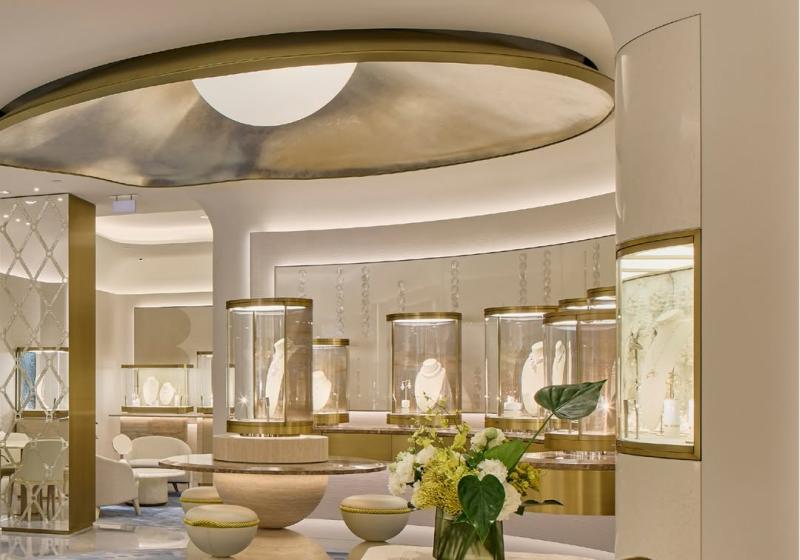 The flowing ceiling design and rounded showcases guide customers naturally through the space, encouraging longer stays and deeper engagement with each piece.