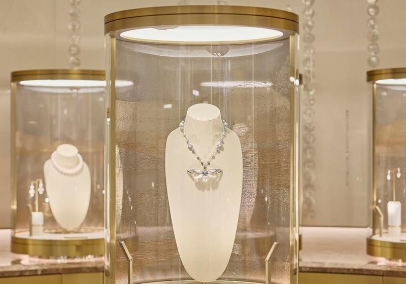 This design is ideal for high-end jewelry brands seeking a calm, sophisticated, museum-like retail presence.