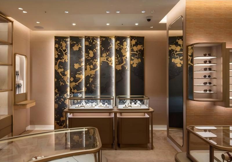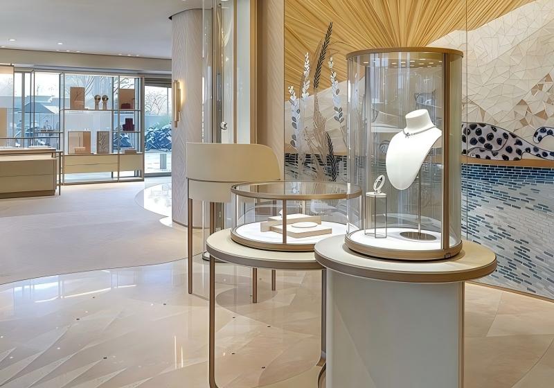 The grand circular ceiling installation, with its delicate floral-inspired lighting fixtures, becomes the focal point, casting a soft, flattering glow over the entire space. Tall, frosted glass wall cabinets diffuse light and add a touch of privacy, while the open layout keeps the space feeling bright and airy. This serene, uncluttered environment encourages customers to slow down, linger, and fully appreciate the craftsmanship of each piece.