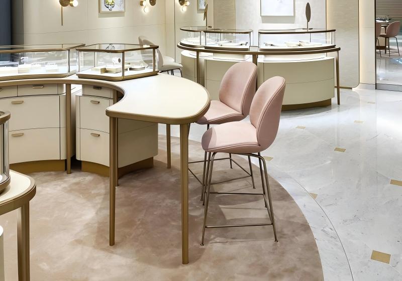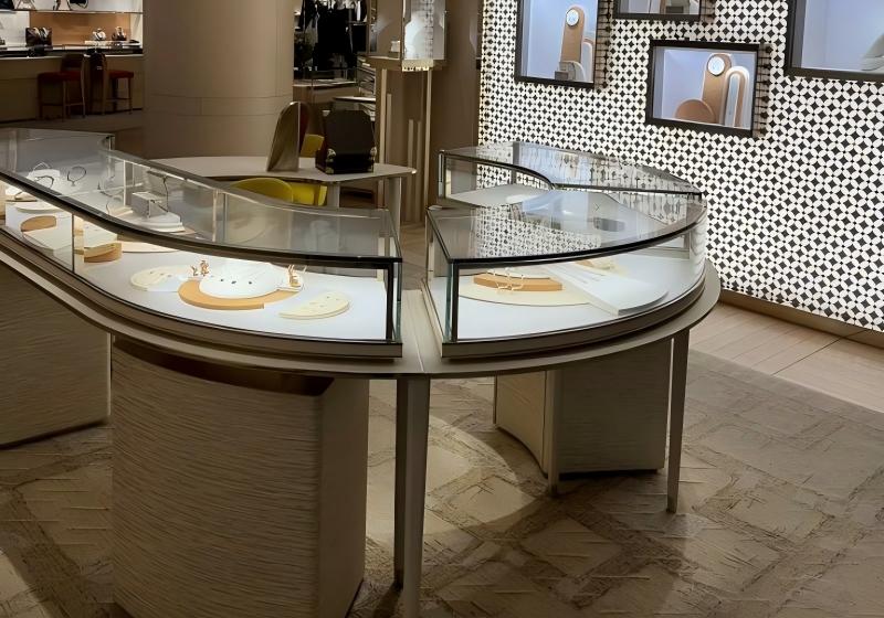 The design is built around fluidity and approachability. The curved display counters, crafted from light natural wood and accented with warm metal trim, create a gentle, welcoming rhythm that guides customers naturally through the space. Each segment of the counter houses its own glass showcase, allowing for a curated, category-based presentation of jewelry.