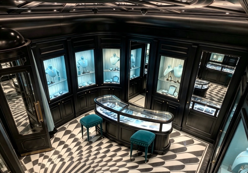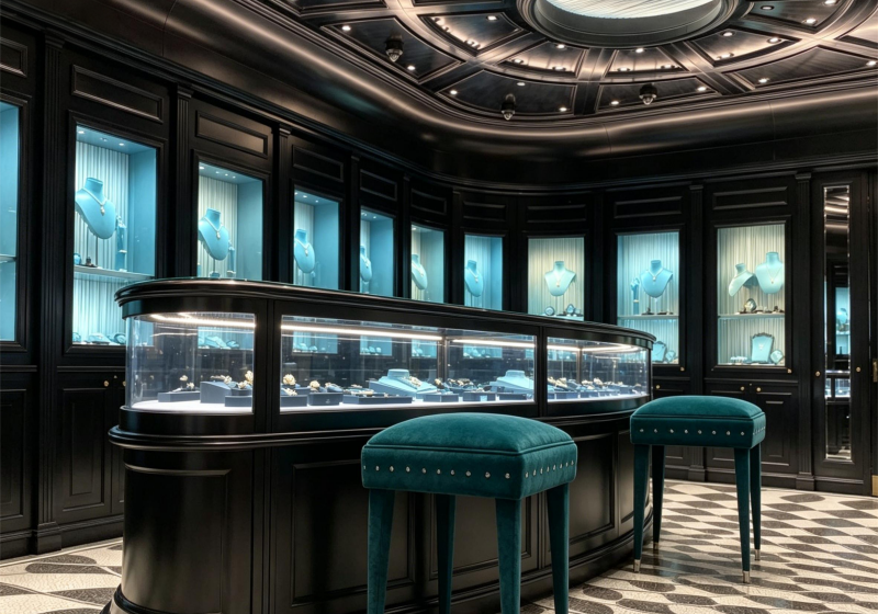 This jewelry boutique embodies a dramatic Art Deco-inspired luxury style, blending deep black millwork, vibrant turquoise accents and bold geometric patterns to create a glamorous, exclusive space for statement fine jewelry, gemstone collections and luxury accessories: