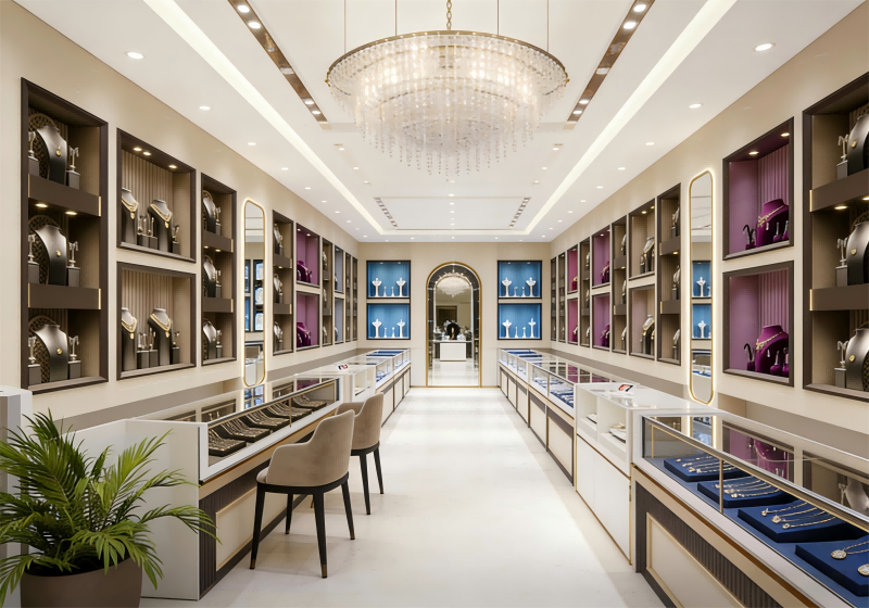 the public display area uses open display cases to showcase the jewelry’s visual appeal,