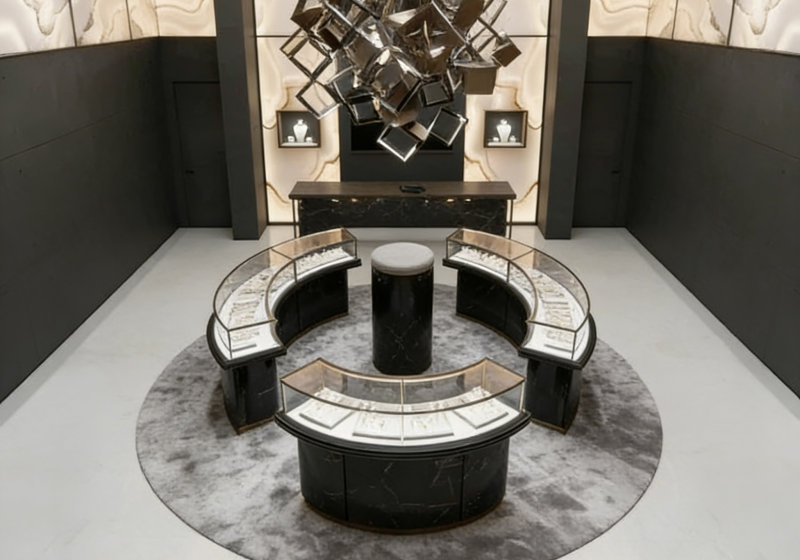 At MyShine, we believe luxury retail should make a statement. Our Modern Urban Luxury Jewelry Display Cases, inspired by the bold, architectural aesthetic of your reference boutique, blend matte black metal, backlit onyx-effect stone, and dramatic geometric lighting to create a retail space that feels both edgy and opulent. More than just fixtures, these custom displays are engineered to showcase your jewelry as art, protect your high-value inventory, and optimize your website for Google search visibility—driving organic traffic and conversions for your luxury jewelry business.