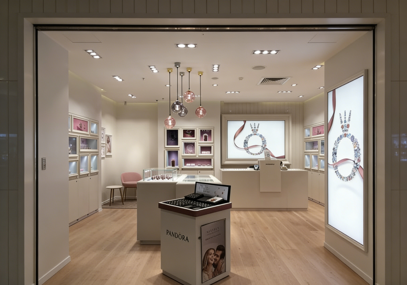 At Myshine, we design and manufacture custom jewelry display cabinets that enhance brand identity, improve product presentation, and elevate the overall shopping experience.This project showcases a modern boutique jewelry store display solution, created for brands that value elegance, softness, and refined luxury.