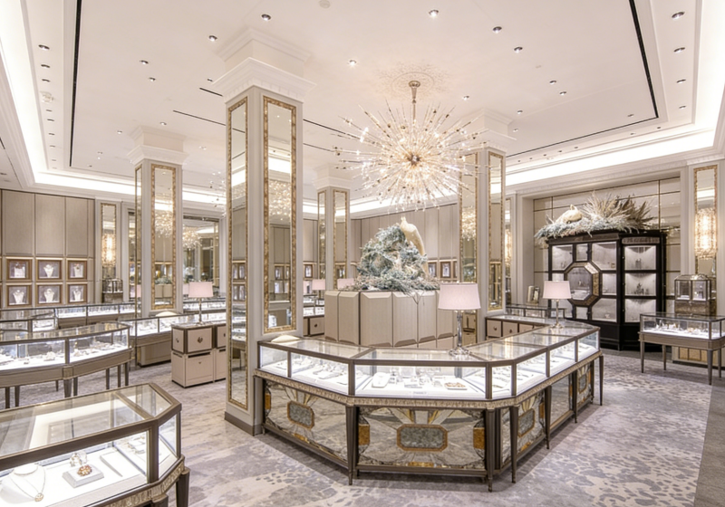 Flexible Layout Options: Mix linear wall-mounted cases (for curated collections), freestanding island displays (for signature pieces like engagement rings), and countertop showcases (for everyday luxury) to create a flow that feels spacious and inviting.