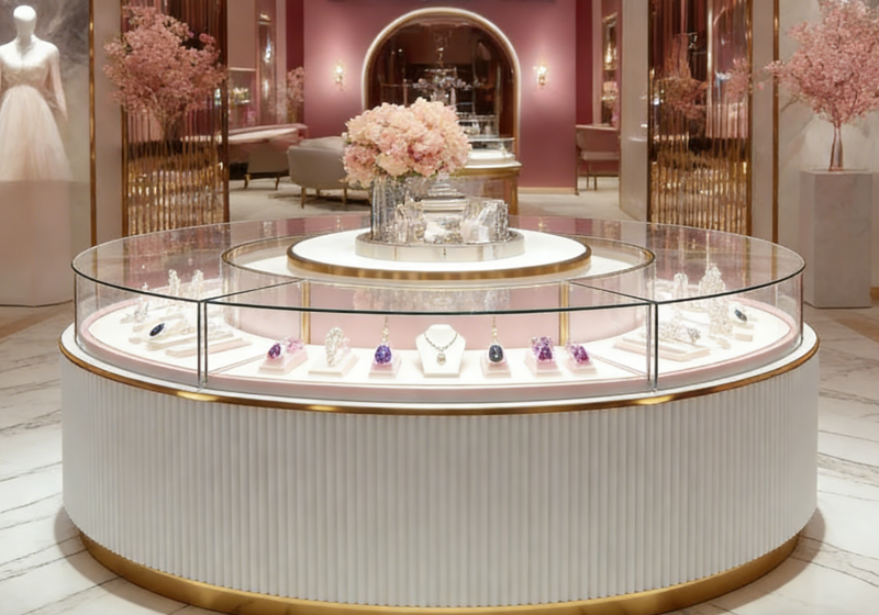 Architectural Harmony: Designed with clean, linear silhouettes and minimalist lines, our cases align with the reference store’s sleek aesthetic. Floor-to-ceiling display cabinets with gold framing, wall-mounted modular units, and central island cases create visual rhythm, guiding customer flow while maintaining an open, airy feel. Subtle details like gold-finished hardware and ultra-clear glass edges enhance elegance without overwhelming your jewelry.