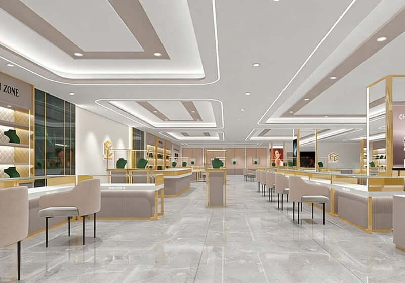 This is an interior design plan for a jewelry store, featuring a modern and luxurious style. The space primarily uses off-white and gold as its main colors, complemented by marble flooring, creating a high-end and elegant atmosphere.