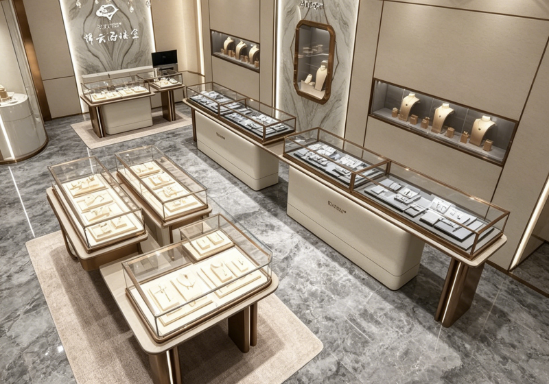 Integrated LED Strip Lighting: Soft, warm backlighting in wall-mounted showcases and under-counter lighting for freestanding cases, casting even illumination across necklaces, rings, and bracelets.
