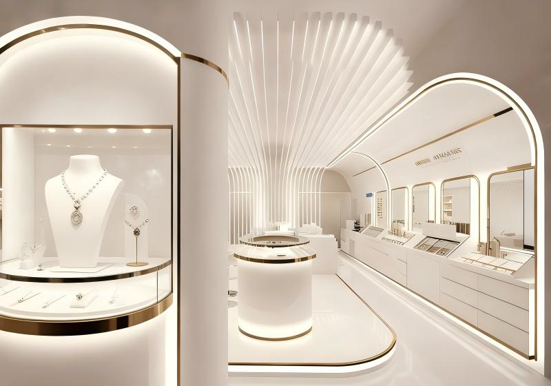 This jewelry store adopts a pure white & light gold futuristic minimalist luxury style, combining radial luminous ceilings, streamlined showcases and arched doorways to create a sleek, avant-garde space for futuristic avant-garde jewelry: