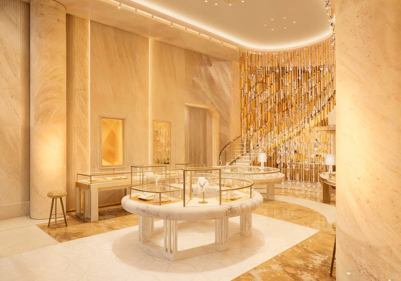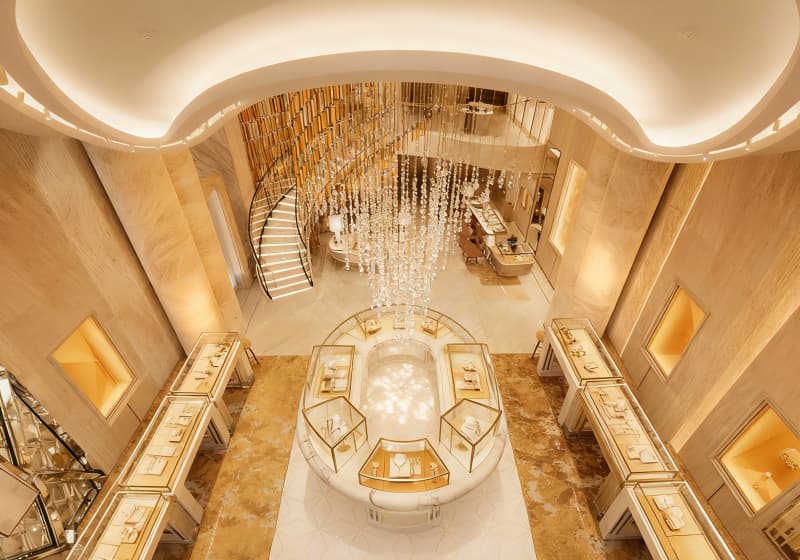 Build a prestigious brand image with gold-toned crystal installations, double-level structures and marble-textured finishes.