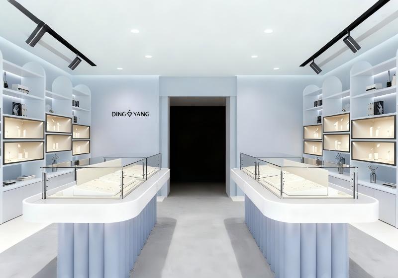 Combining vertical-texture showcases, suspended luminous shelves and embedded lightboxes to create a soft, bright space for youthful fashion jewelry: