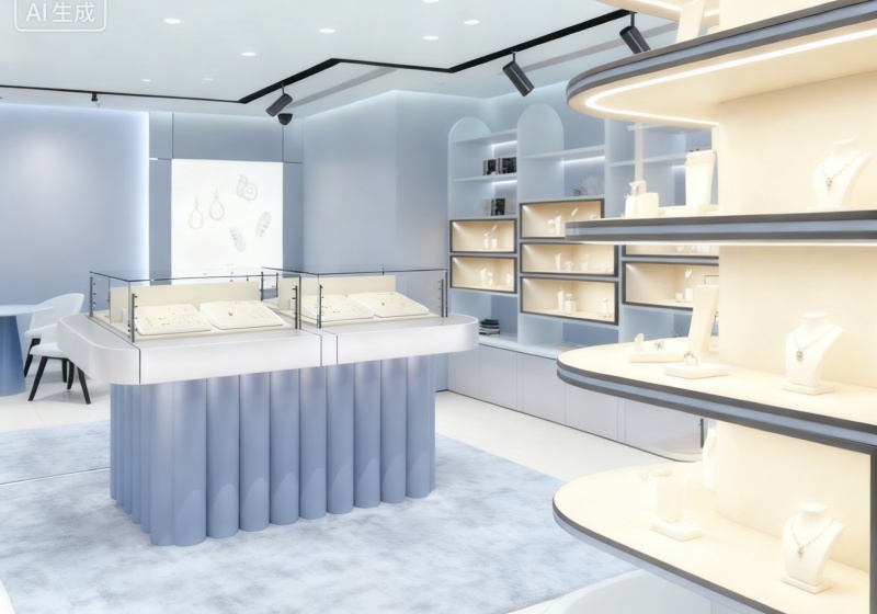 Plan an open, layered spatial layout (central curved showcases + wall-mounted embedded displays + suspended shelf zones) to balance jewelry display and relaxed browsing experience.