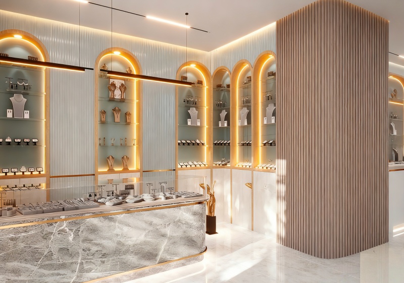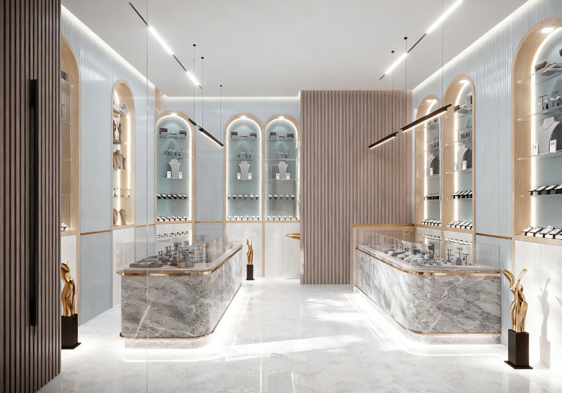 This jewelry store adopts a soft mist white & beige elegant light luxury style, combining arch embedded showcases, marble counters and vertical-stripe panels to create a soft, refined space for light luxury jewelry: