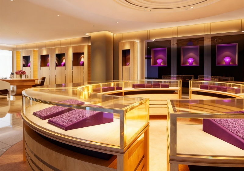 This jewelry store adopts a warm gold & light wood luxury style with purple accents, combining curved showcases, warm-light domed ceilings and embedded purple-light displays to create a magnificent, high-end space for premium colored gemstone jewelry: