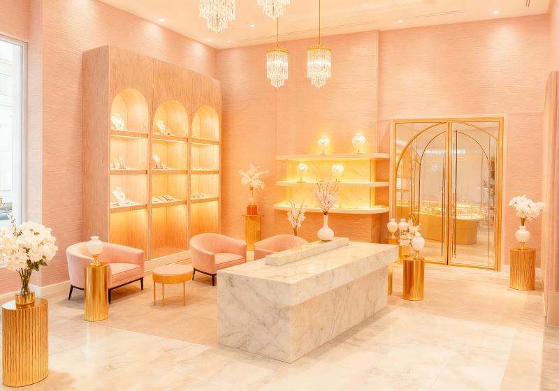 This jewelry store adopts a blush pink & light wood romantic light luxury style, combining arched luminous showcases, crystal chandeliers and pink soft furnishings to create a gentle, sweet space for women-oriented light jewelry: