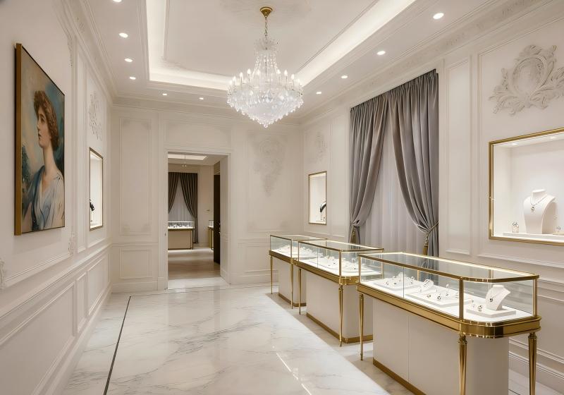 The layout features symmetrical linear showcases + wall-mounted display niches + private browsing zones, balancing jewelry visibility and luxurious appreciation.