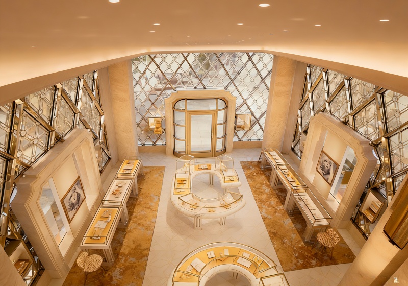 This top-tier jewelry store adopts a beige & gold French luxury style, combining diamond-patterned art glass, curved marble displays and symmetrical layouts to create a prestigious space for high-end couture jewelry: