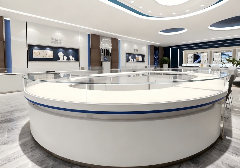 The layout features a central circular showcase + wall-mounted display shelves + open browsing zones, balancing jewelry visibility and relaxed exploration.