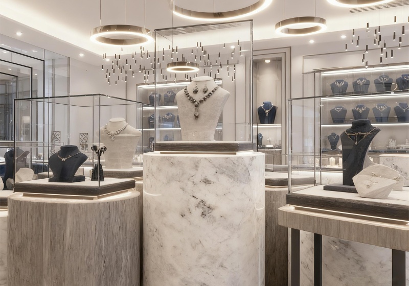This jewelry store adopts a white & deep blue urban minimalist luxury style, combining marble display stands, metal ring lights and open transparent layouts to create a high-end, urban-textured space for premium designer jewelry: