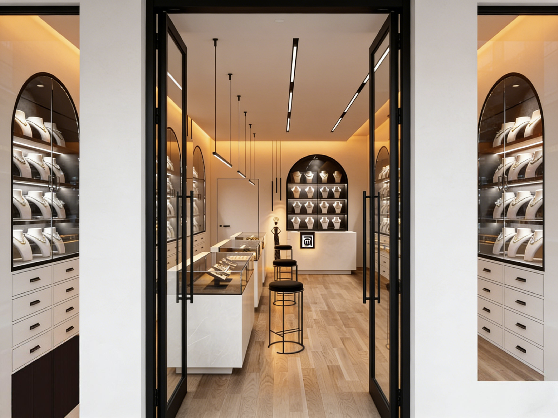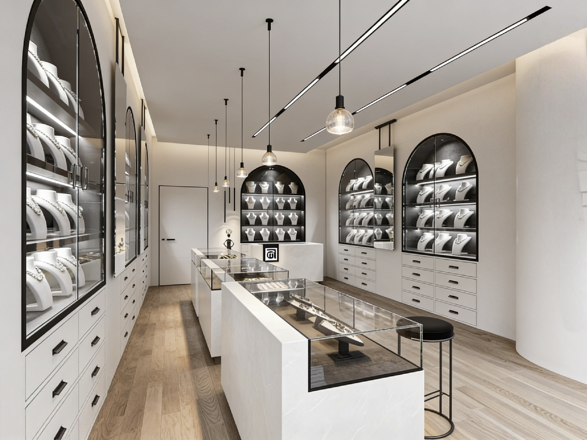 • The symmetrical layout combines wall-mounted arched display cabinets and central glass counters, maximizing vertical and horizontal display space while fostering a calm, exclusive shopping experience.