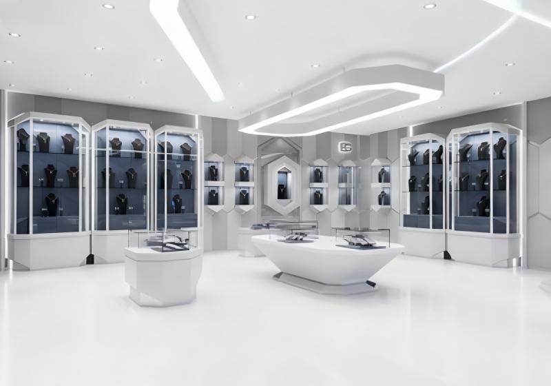 Brand Image: Matte white + polished silver geometric accents + dark displays for a cutting-edge look.