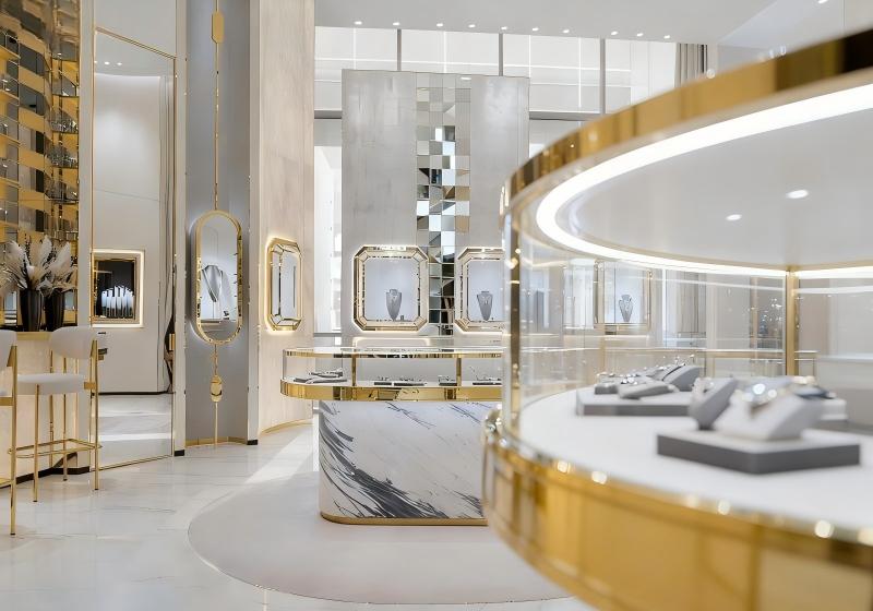 Showcases: Gold-framed glass showcases to highlight intricate jewelry details.