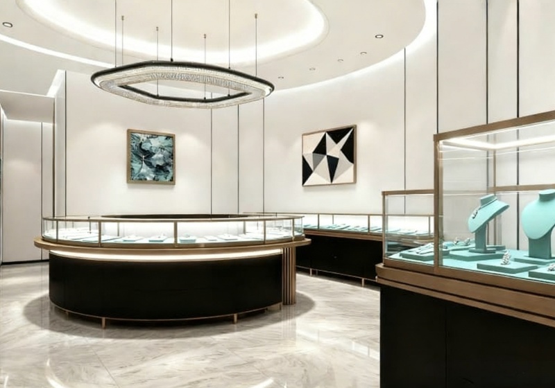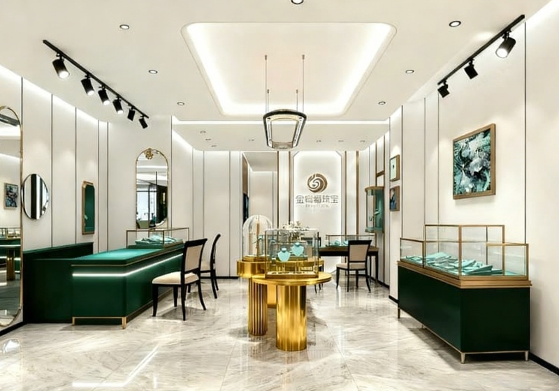 Use transparent glass showcases with rose gold frames to highlight jade jewelry’s texture against the white-and-black backdrop.