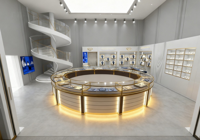 Plan a dual-layer spatial layout (with ground-floor circular showcases and upper-layer access via spiral stairs) to enhance layered jewelry appreciation.