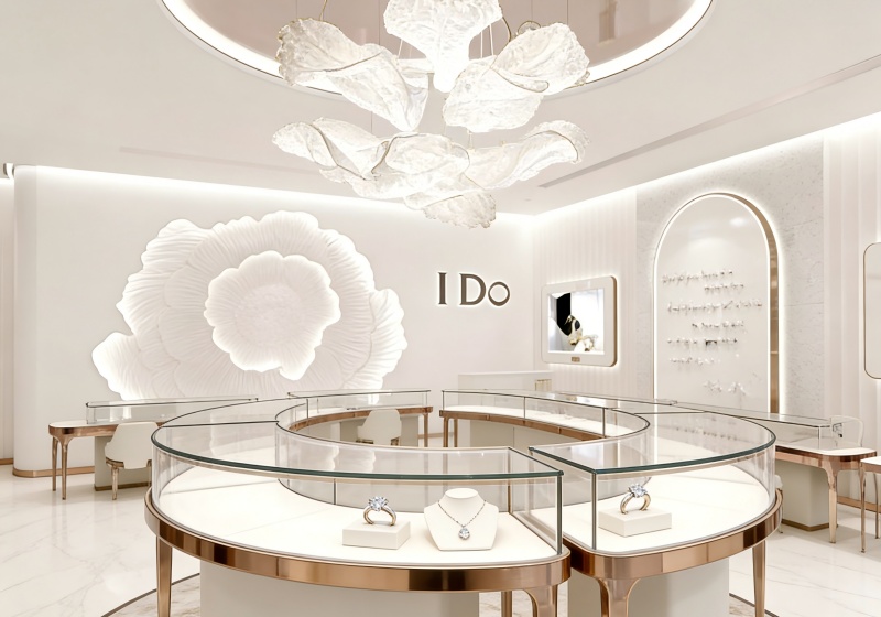 The layout features a central circular showcase + wall-mounted arch displays + intimate seating zones, balancing jewelry visibility and romantic browsing experience.