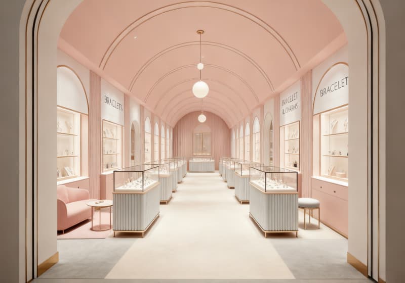 This jewelry store adopts a pastel pink & white light luxury style, focusing on bracelet and charm displays to create a soft, welcoming space for young female customers: