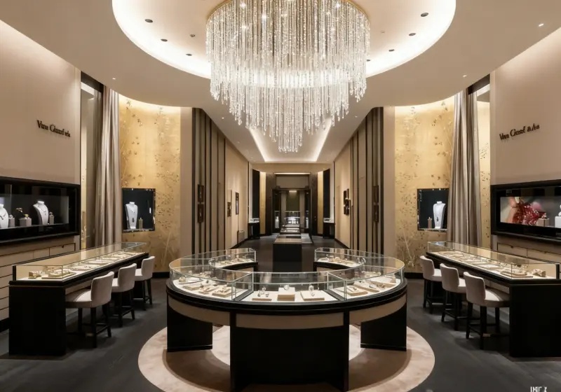 Use luminous glass display cases to highlight jewelry’s luster against the elegant mix of modern and oriental elements.