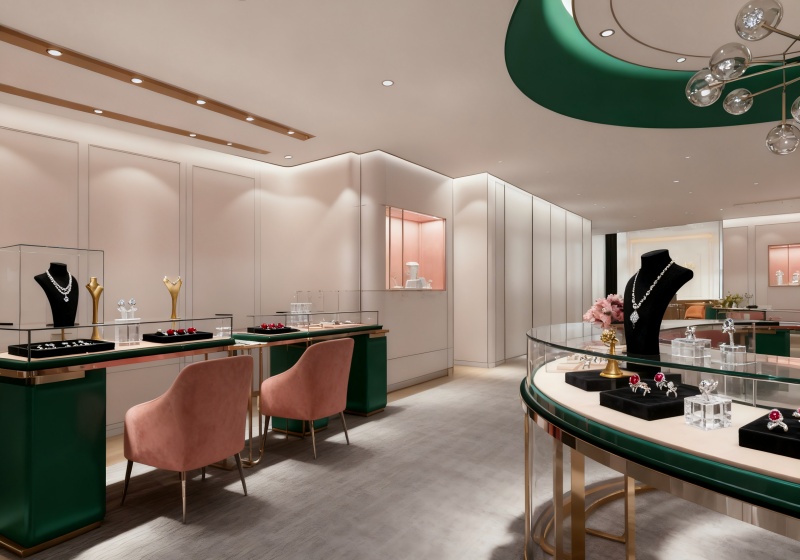 Combining curved luminous ceilings, crystal chandeliers and streamlined showcases to create a romantic, opulent space for retro-style light luxury jewelry: