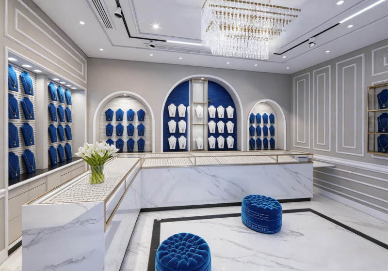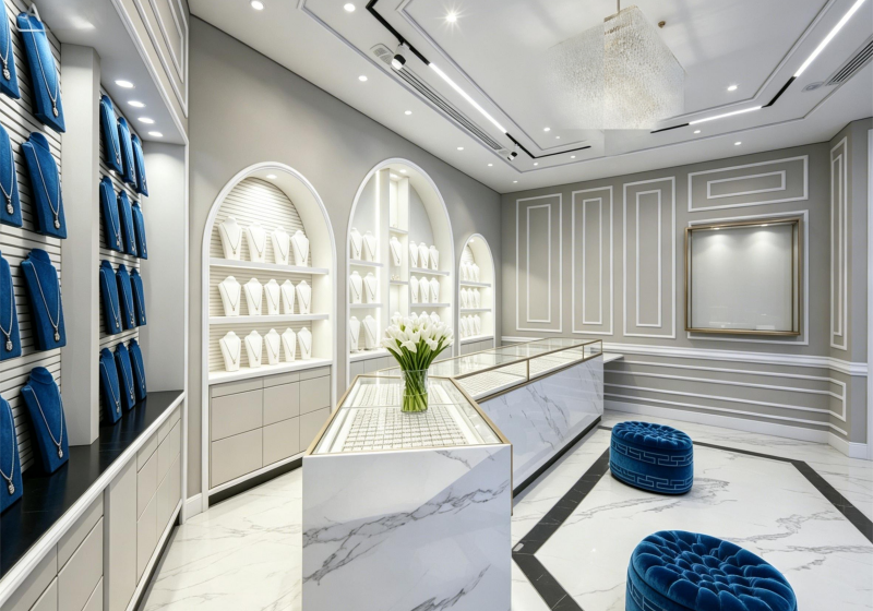 This premium jewelry boutique display system features a striking royal blue & white marble color scheme, paired with arched wall showcases and a statement crystal chandelier. Designed for high-end gold and fine jewelry brands, it creates a bright, luxurious, and culturally rich retail environment that elevates product visibility and brand prestige.